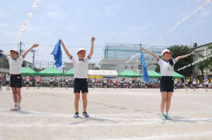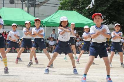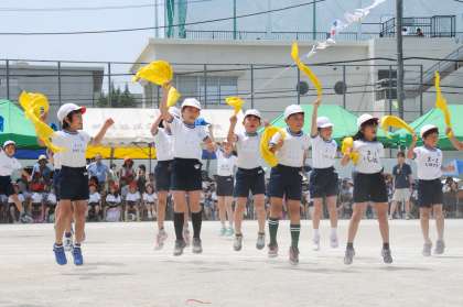 【LIFE IS A PARTY】 ファンキーモンキーベイビーズの明るいテンポの速い曲に乗って、赤・黄・青のバンダナを元気いっぱいに振りながら踊りました。リズムに合わせて楽しくかっこよく踊れるように、一生懸命練習してきました。はじける笑顔いっぱいに踊ることができました。