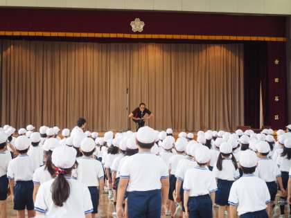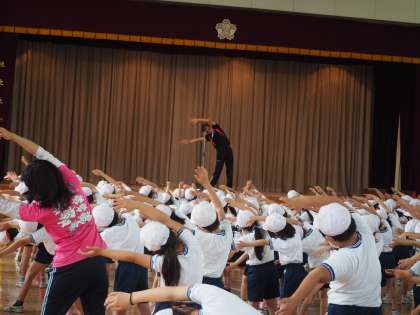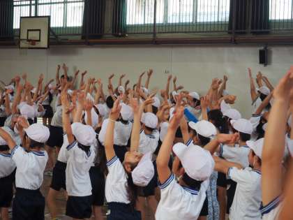 低学年の児童は壇上の先生の動きを真似しながら練習しました。