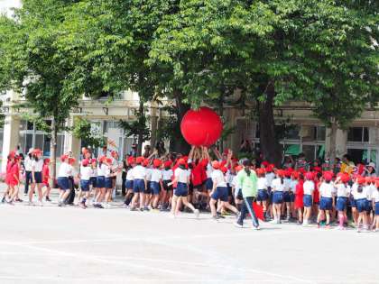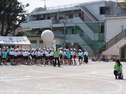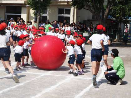 6年生が大玉を一年生の前にもって行き 6年生のところまで運びます。