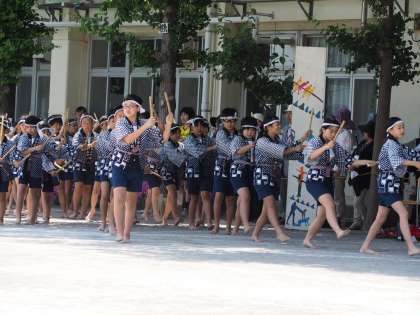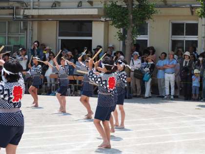 おそろいの法被 太鼓を3台 樽太鼓 を使っておどります。