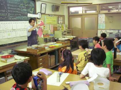 最初に本時の学習についての話を聞き、作成のポイントを教えてもらいます。材料や用具の置いてある場所、使い方などの確認をし、作成を始めました。