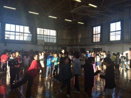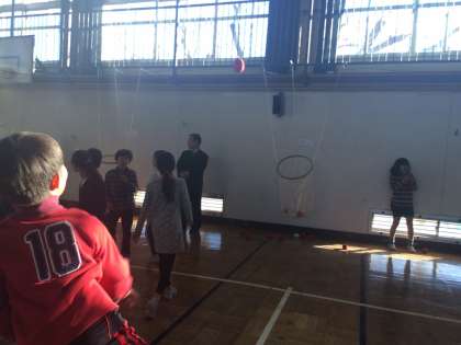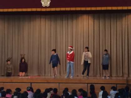 プレゼントをつめることに大忙しのサンタさん。全校児童が袋詰めをお手伝いするゲームを行いました。