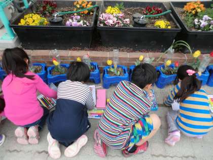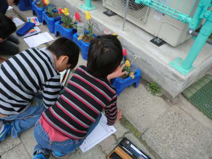 2年生の授業風景です。チューリップの観察を行い、カードに気付いたことを書きました。2年生が心をこめて育てている色とりどりのチューリップがかわいらしく美しく職員室前で咲いています。