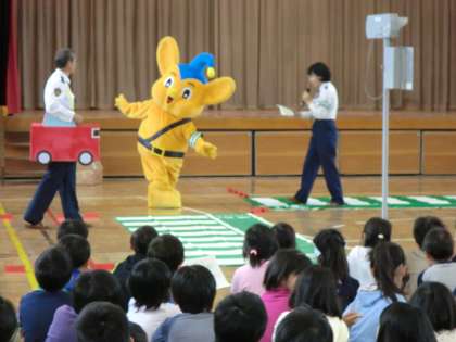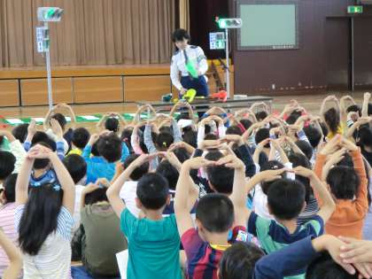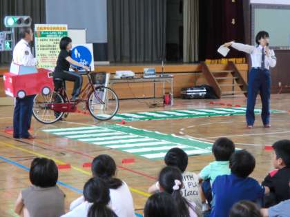 5月7日、北沢警察署の皆さんのご協力により、交通安全教室が行われました。低学年の部(1〜3年生)には、警察官の皆さんのほかに、ピーポくんも登場です。楽しく交通安全について学ぶことができました。高学年の部(4〜6年生)では、自転車の安全な乗り方を教えていただきました。「青信号・・・右見て、左見て、右見て」自分の目でしっかり安全確認をすることの大切さを学びました。そして、自動車の運転手さんの目を見て、アイコンタクトをとることが、事故の未然防止につながることも知りました。最後に、今日、ご指導いただいたお巡りさんが作詞・作曲した「やさしい道」をみんなで歌いました。