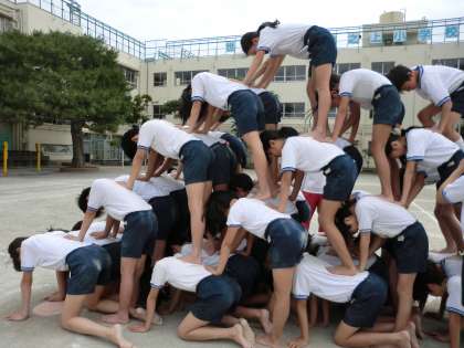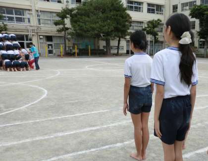 5・6年生は、技の完成を目指し毎日練習を重ねています。しかし大切にしているのは技そのものの完成だけではありません。演技が終わった後の待つ姿勢も大切な演技の一つと考えています。指先を伸ばし、すべての演技が終わるのをしっかり見届けます。大技は、支える力も重要です。一人一人が自分の持ち場をしっかりと守ることで、一つのすばらしい演技が生まれます。