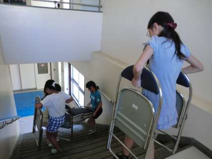5・6年生のリハーサルが終わると、続いて5・6年生は運動会前日準備を行いました。運動会当日の係に分かれて明日の確認や準備を行います。応援の練習、太鼓の練習、審判の確認、得点の確認、放送原稿の確認、大プログラムのはり出し、椅子や机の運び出しなどなど、このほかにもたくさんの仕事があります。運動会の練習で疲れている中、進んで仕事に取り組む子供たち。さすが池之上小学校の自慢の高学年です。