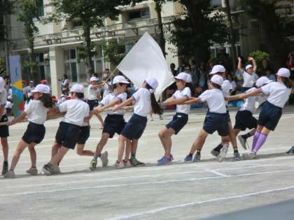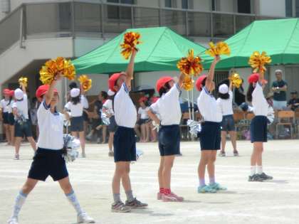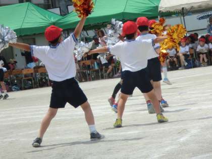 3年生は、「つなひきと」「Road to Giory」を行いました。つなひきは4年生と一緒に力を合わせました。綱をひいている仲間にトラックを走って助けに行きます。「Road to Giory」は、リズム・テンポよく爽快に踊ります。3年生の子供たちは、体いっぱいつかい弾むように踊っていました。楽しそうに踊る姿を見ていると、思わず一緒に体を動かしたくなりました。踊ることが「たのしい!」そんな思いが伝わってきました。最後に、学年全員で「75」という文字をつくりました。今年度、池之上小学校は開校75周年を迎えます。そのお祝いを込めてがんばりました。