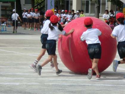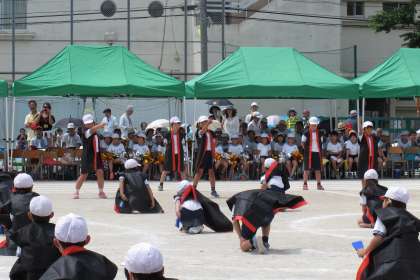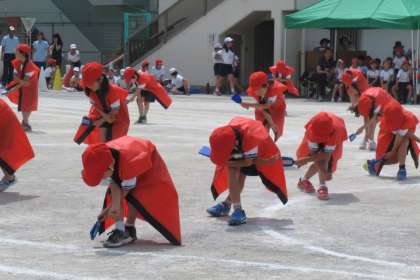 2年生は「大玉ころがし」と「ヨッシャ来い!」を行いました。大玉ころがしは、4人で一つの大玉を転がしながら次の友達にバトンします。この大玉、子供たちの体ほど大きくて、なかなか前が見えにくい様子です。でも、4人で力を合わせて転がす子供たちがとてもかわいかったです。最後の最後まで大接戦。観客席をわかせました。「ヨッシャ来い!」は、赤と黒の袢纏をはおり、堂々と切れのいい演技をしました。かけ声もすばらしかったです。昨年入学した2年生も学校生活2年目に入りました。大きな成長を感じました。