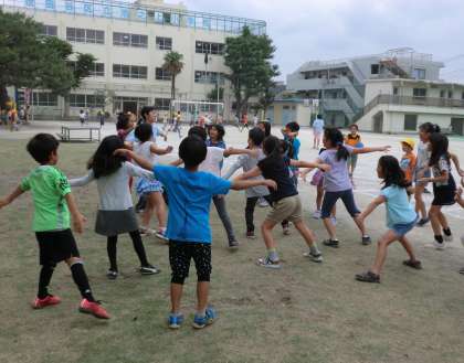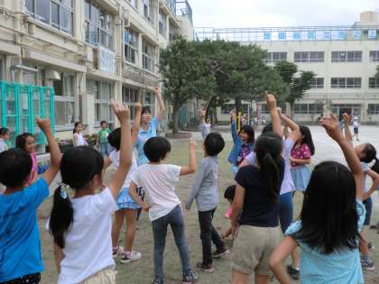休み時間に、楽しそうにダンスをする子供たちと先生の姿がありました。元気いっぱい、笑顔いっぱいのひとときを見ていると、思わず笑みがこぼれます。
