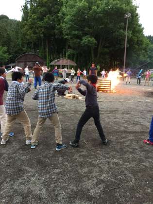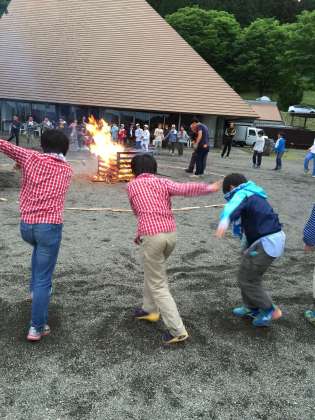 楽しみにしていたキャンプファイヤーがはじまりました。炎を囲み、楽しいゲームや歌やダンスで盛り上がります。