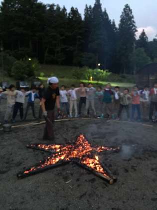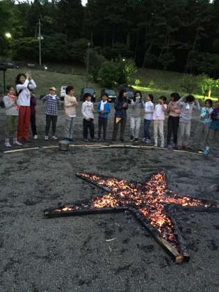 キャンプファイヤーの終盤、ずっとお世話になっている補助員さんからすてきな贈り物がありました。みんなでこの美しい火を囲み、「ありがとうございます」のお礼の気持ちを伝えました。