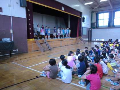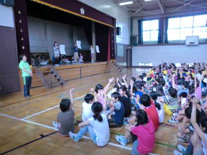 朝の時間に「集会」が体育館で行われました。この集会は、集会委員会の企画・運営で進行されました。全校児童が楽しむことのできる内容を考え、準備を進めました。今日は、新しく着任した先生に関するクイズ大会です。「好きな色は何色でしょうか。」「好きなスポーツは何でしょうか。」などの質問に一生懸命に答える子供たち。集会を成功させるために、集会委員会の子供たちは、インタビューしたり原稿をつくったり役割分担を考えたりしました。楽しい集会になりました。集会後は活動を振り返る反省会を行い、担当の先生からもおほめの言葉をいただきました。