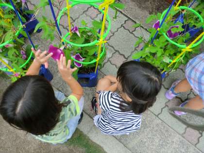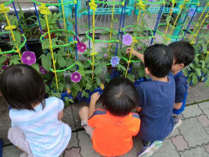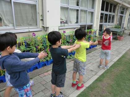 毎朝欠かさずアサガオの水やりを行っている1年生。ここのところアサガオの花がたくさん咲き続けています。つるも子供たちの背の高さを超えるくらい延びてきました。7月8日3時間目に、大切に育ててきたアサガオを1年生が観察していました。「12個も咲いているよ」「つぼみもたくさんあるよ」そんな話をしながらアサガオを大切そうに見つめます。観察が終わった子は、自分たちで進んで「前にならえ」をして整列していました。立派な1年生です。