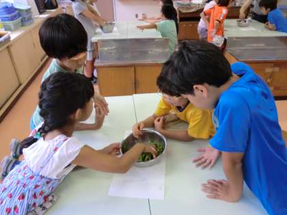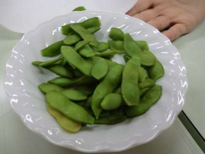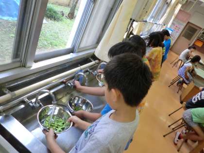 7月15日、4年生が育ててきた枝豆の収穫を行いました。たくさんの枝豆が実ったので、みんなで枝豆を味わうことになりました。班で協力して枝豆をていねいに洗い、塩もみをして、ゆでる前の準備が整いました。ゆであがった枝豆は、きれいな緑色をしていておいしそうです。自然の恵みをいただくことへの感謝の気持ちをもちながら「いただきます。」をしました。子供たちは、「おいしい」「あまいね」などと話しながら、あっという間に本日収穫の枝豆を完食しました。