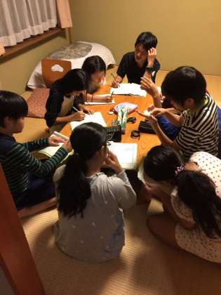 各部屋の室長が集まり、今日の反省会を行いました。もう少しがんばったほうがいい点について、解決策を話し合いました。子供たちが自主的に行動することが、日光林間学園の一番の目標です。各室長は話し合ったことを部屋のメンバーに伝え、今日は就寝です。9時を過ぎると、それぞれの部屋は消灯し、静かになりました。おやすみなさい。
