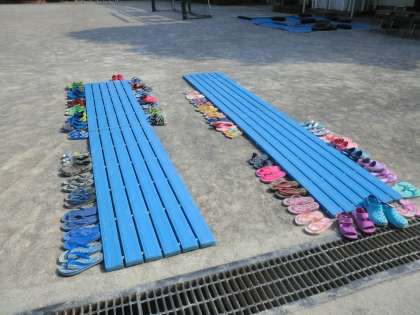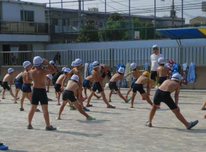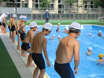 7月31日、夏季水泳指導の前期の最終日となりました。1回目は1・2年生の時間です。今日は52名の1・2年生と10名の水泳部の6年生が参加しています。準備体操をしっかり行い、くつをそろえて、シャワーを浴びて、水泳の時間がスタートです。水の中への入り方には「1・2・3・4」のルールがあります。ルールをしっかり守り、上手に水の中に入る1・2年生。立派です。