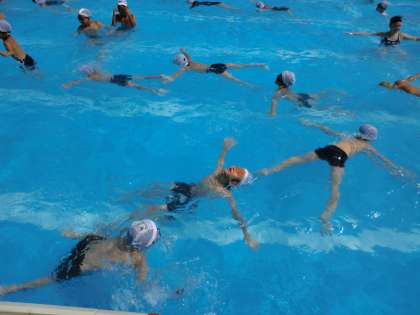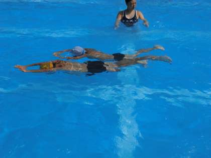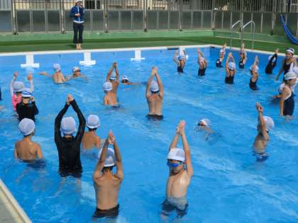 1・2年生のプールの時間は、「水遊び」を通して様々なことを学びます。お尻やおへそを水底につけたり、じゃんけんゲームをしたりしながら水慣れを行いました。えんぴつ浮きや「大」の字浮き、クラゲ浮き、だるま浮きなど、楽しみながら浮く練習もしていました。
