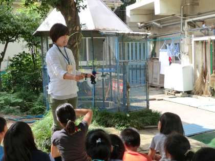 ヤゴの観察のほかにも、カメ小屋の近くのビオトープの整備を行いました。トンボの生息にふさわしくない水草を教えていただき、水草抜きを行い、環境作りを進めました。学習中に「シオカラトンボ」がやってきて、実際のトンボを観察することもできました。カエルも見つけることができました。自然の来訪にみんなで大騒ぎです。生き物が人と共に生きていく環境をこれからも大切にしていきたいと思っています。