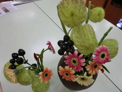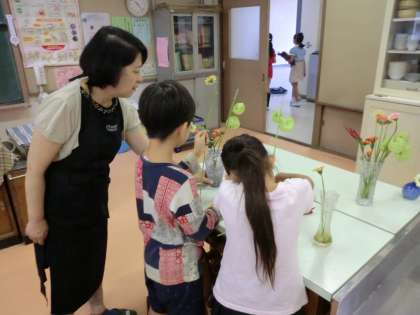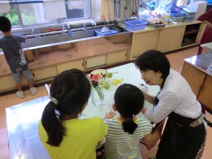 9月10日は、月1回花ボランティアの方に来ていただく日です。今日もきれいな花や緑の植物を子供たちの豊かな発想で生けました。教えていただいている先生が子供たちの協力するする姿に感心していました。花をどのように生けるとよいか意見を出し合い、異なる意見への解決策を考えて、共同作業している姿に驚かれたのです。花を生ける活動の場は、自然を楽しむ豊かな心と問題解決や協力する力の発揮の場となりました。9月の花は、ガーベラ・フウセンカズラ・鷹の爪・・・各教室に飾っています。