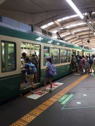 江ノ電に乗りました。元祖江ノ電の緑の電車にみんな大喜びです。小さな駅を通過したり、路面を走ったりしながら、世田谷区では見ることのできない風景を楽しんでいます。