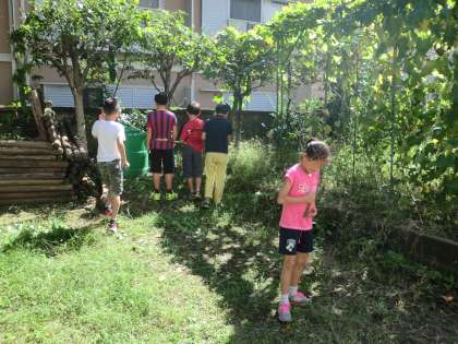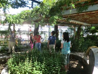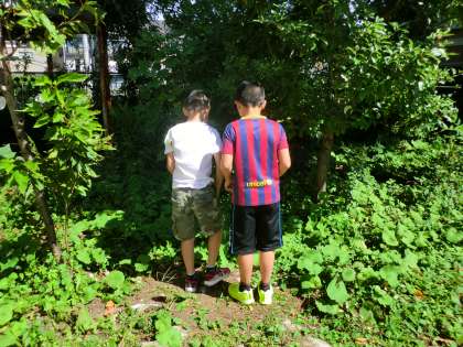 水曜日のビオトープの時間にたくさんの子供たちが裏庭に集まってきました。3・4年生の子供たちは、さっそく虫探しに夢中です。バッタやコオロギを一生懸命に探しています。子供たちにとって自然の中で遊ぶことは、とても楽しい時間のようです。ほかにも、藤棚の藤の実を取って、その実のふわふわ感を豊かに感じ取っていました。