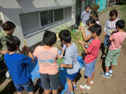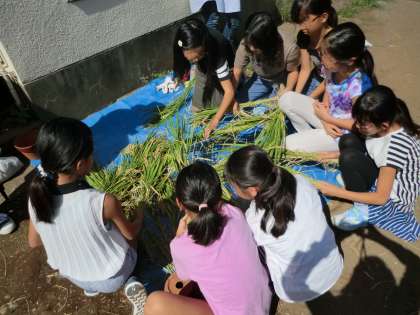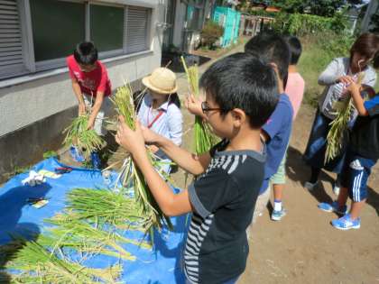 ビオトープの時間に引き続き、5年生が育てた稲の収穫が子供たちの手で行われました。5年生は、米を守るために、水の管理をしたり、すずめなどからお米を守るために網掛けをしたりするなど、田植えから稲刈りまで、一生懸命にお世話をしてきました。豊作に対する思いはひとしおです。何度も交代しながら稲を刈りました。この後はお米になるまでの過程を学んでいきます。