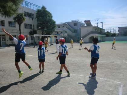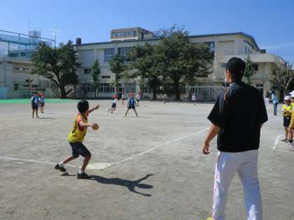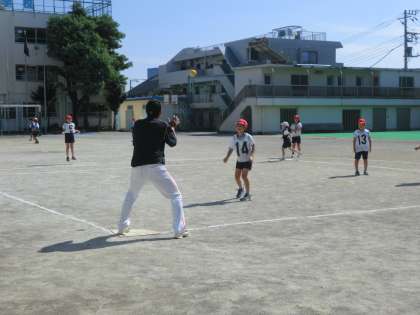 投げ方練習の後は、いよいよ試合です。今日は「投げる」動作だけを使った試合です。楽しいルールのもと、子供たちは練習の成果を発揮していました。友達を応援する態度も立派です。チームの仲間が得点を入れると、体いっぱい使って大喜び。ジャイアンツのコーチに教えていただいた試合を楽しみました。