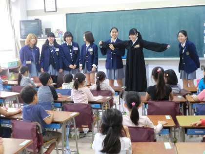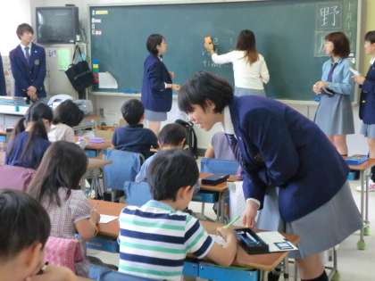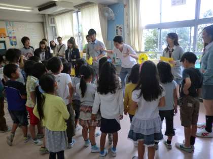交流活動の様子です。1・2年生を担当した高校生の皆さんは、小さな学年の子供たちにもわかりやすいように、ゲームや歌などを用意してくださいました。子供たちの目線に立って、表情豊かに活動する高校生たちのすばらしさに感心しました。池之上小学校の子供たちも、楽しそうに笑顔いっぱいで外国語や外国の文化に触れることができました。