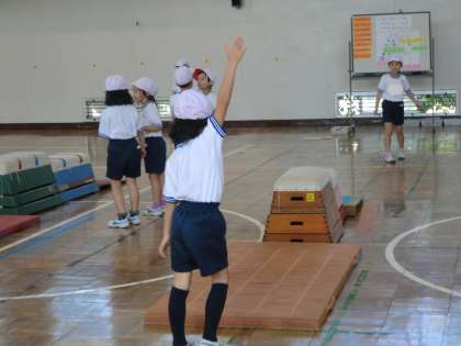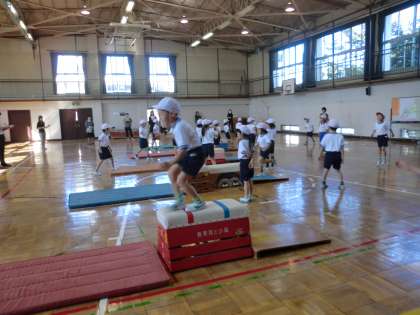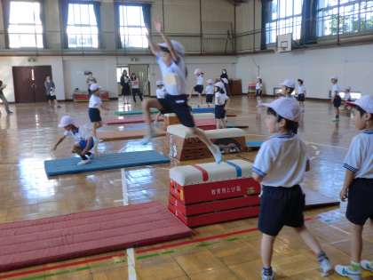 10月14日、学校で研究会が開かれました。1年生の体育の授業の公開と講師の先生をお招きした協議会を通して、より良い授業づくりを目指した教員の研究会です。今日は「とびばこあそび」についての授業でした。子供たちは、楽しそうに、一生懸命に、より上手になるために、ほんとうによく体を動かし、友達と声を掛け合うことができました。技が上手に決まるととてもうれしそうです。友達のいいところもたくさん見つけることができました。安全にも気を付けて運動する子供たちの姿もありました。自分の跳ぶ活動が終わると「はい」と手をあげて合図をします。子供たちの頑張りが光った1時間となりました。
