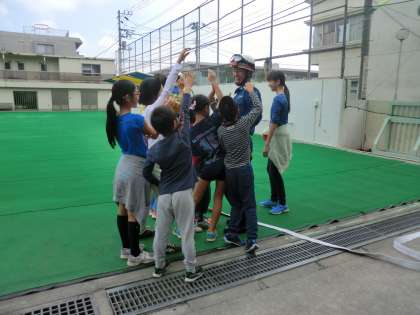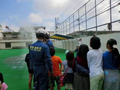 災害用伝言ダイヤル171の使い方を教えていただきました。また、世田谷消防署の皆さんのご協力のもと、スタンドパイプ設置と放水訓練を行いました。放水訓練は子供たちも楽しく参加し、水の力の強さを実感しました。
