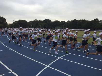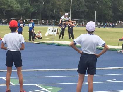 エンジョイランニングでウォーミングアップ。午前中は女子の競技が行われました。100メートル走、ハードル走、高跳び、走り幅跳びにそれぞれエントリーしてがんばりました。高跳びは何とBブロック優勝です。ほんとうにがんばりました。