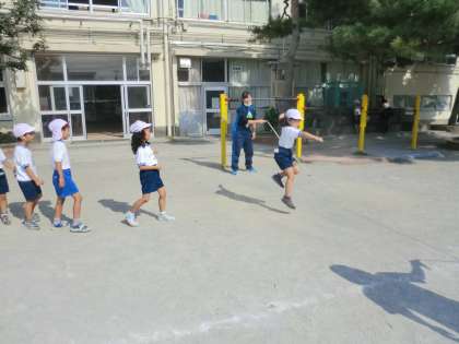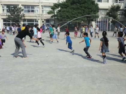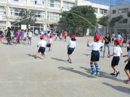 11月5日・6日に行われる「ながなわ大会」に向けて、20分休みに「ながなわタイム」がありました。どのクラスも校庭でながなわの練習に励みます。途中で引っかかった時には「ドンマイ」と友達を励ます声が自然と起ります。一生懸命に縄の動きを目で追いながら、跳ぶコツをつかもとする子供たちもいます。自分たちのクラスの目標に向かって、努力が続きます。1年生は、6年生の先生やお兄さんお姉さんのお手伝いがありました。1年生もがんばっています。