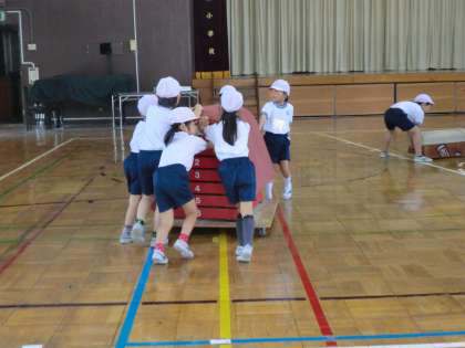 1年生の体育、「とびばこあそび」の学習の様子です。自分たちで整列し、自分たちで準備をし、自分たちで片づけを行うことできる1年生。とても立派な態度で授業に臨めました。とびばこ遊びもたくさんの工夫をしながら練習し、今日の目標の一つの着地がとても上手になりました。友達の良いところをしっかり伝えることもできました。1年生の頑張りが光っていました。