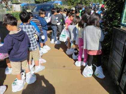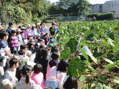 10月26日、3年生の子供たちが深沢にある農園にさといも掘りに出かけました。農園に着くと、帰りのバスが汚れないようくつにビニル袋をかけました。先生のお話をしっかり聞き、さといもの掘り方を教えていただきました。「とっても上手な聞き方ですね。お話を聞いてくれるのでうれしいです。」とお褒めの言葉をいただきました。さあ、いよいよさといも掘りです。