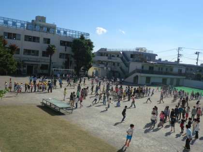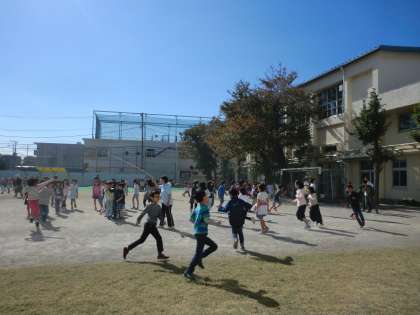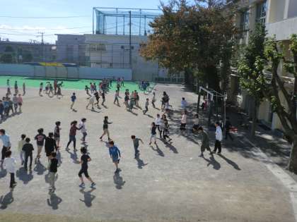 毎日、20分休みは「ながなわタイム」の時間です。全校でながなわの練習を行います。今日は、ながなわ大会に向けての最後の「ながなわタイム」です。校庭に12学級のながなわチームができます。各チームから「ハイ・ハイ・ハイ」という声が響きます。