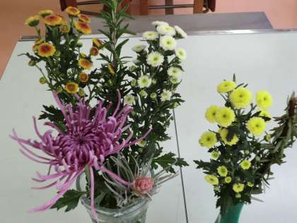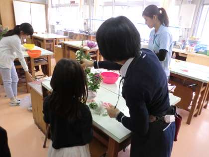 11月5日、月に1回の「花を生ける日」がありました。花ボランティアの皆様が11月のお花を届けてくださいました。今月の花は「キク」「ローズマリー」「スプレーマム」「チランジア」でした。ローズマリーの香りを感じながら、子供たちが自分たちのアイディアで花を生けました。花のある教室は心が豊かになります。いつもありがとうございます。