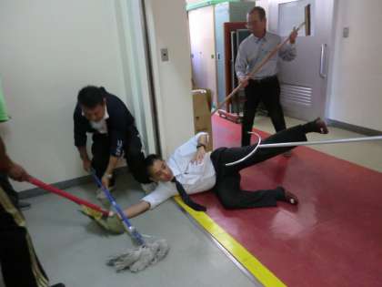 訓練は、子供たちが災害時や緊急時に自分の身を守るための行動や集団でとるべき行動を身につけるために行いますが、同時に教職員の訓練でもあります。今日は、子供たちが教室の片隅で安全確保の放送を待っている間、警察官の方が迫真の演技で不審者を演じ、教職員が不審者を抑え込む方法を学びました。刃物を持っている不審者に立ち向かうためのこつや大切なポイントを教えていただきました。