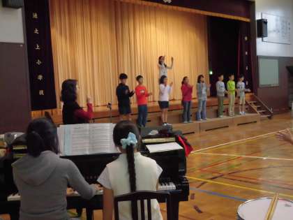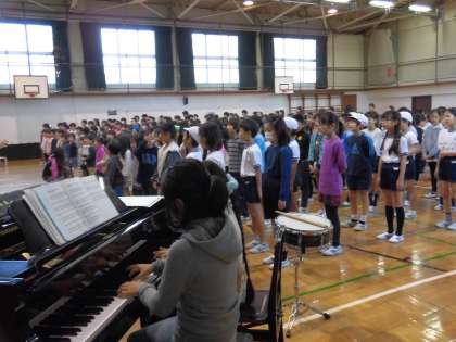 11月12日の音楽朝会では、学芸会のオープニングで歌う「幕を開ける歌」を練習しました。音楽委員会の子供たちが舞台に立ち、モデルを示します。堂々としたセリフや歌に感心しました。ピアノの伴奏や司会進行も音楽委員で行いました。