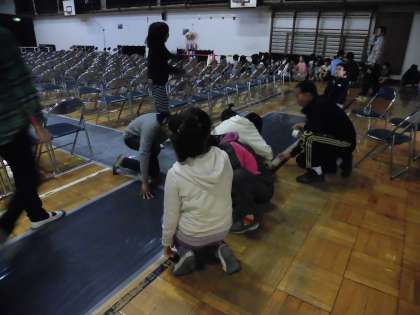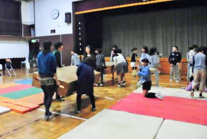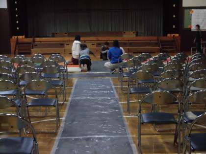 明日は学芸会保護者鑑賞日です。6年生が明日の会場づくりに取り組みました。椅子を並べたり、マットを敷き直したり、通路になるシートを敷いたりと大活躍です。迫力あるすばらしい演技だけでなく、裏方の仕事も快く引き受け、一生懸命にがんばることのできる6年生です。6年生が敷いた通路用シートは、保護者の皆様の移動通路になります。また、子供たちが演技に使用する場所になりますので、明日は円滑な運営にご協力よろしくお願いいたします。