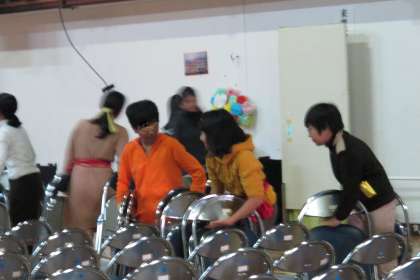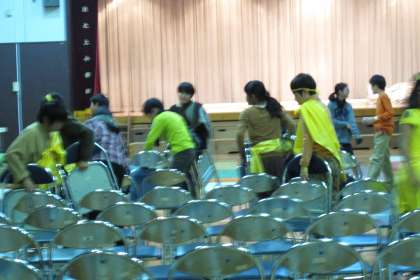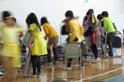 最後の学芸会。力を出しきってすばらしい「ライオンキング」の世界を表現した6年生。舞台の裏で、成功をたたえ合いました。学芸会の余韻が残る中、会場の椅子片付けです。どんなことにも一生懸命に、前向きにがんばる6年生に「ありがとう」の心をおくります。