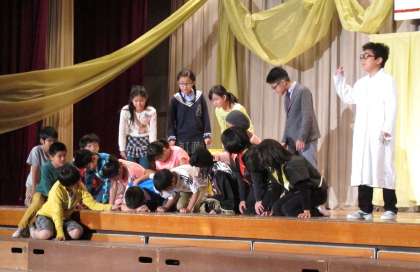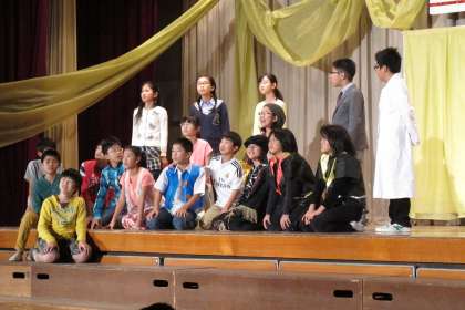 5年生の劇。子供たちが表現したテーマが心に響きます。楽しい場面、迫力の場面、迫真の表現力、心を込めて歌い上げたソロ、みんなの心を一つにして歌ったあたたかくて美しい歌声、劇を盛り上げるダンスの数々。ほんとうに見ごたえあるすばらしい舞台を創り上げました。最後の場面では、すべての子供たちの思いが一つになって、私たちを感動の世界に導きました。5年生の皆さん、すてきな劇をありがとう。