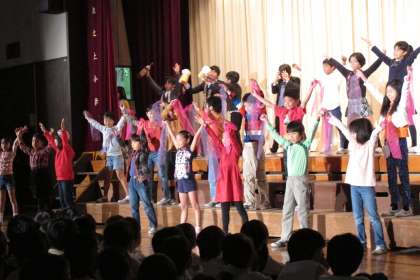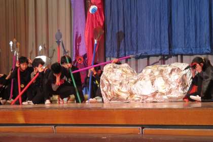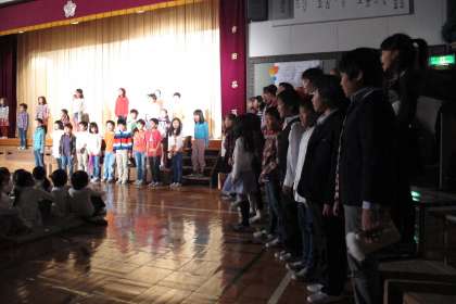 3年生の演じた魔界の世界、とても迫力がありました。子供たちは語ります。「ほんとうの豊かさとは・・・」子供たちの表現するテーマに心打たれました。子供たちの歌う歌に引き込まれました。地球を守るために、私たち人間がほんとうに大切にしなければならないことを、3年生の劇を見ながら考え続けました。心の中に、あたたかさや美しいものを大切にする思いが膨らみました。3年生のみなさん、すてきな劇をありがとう。