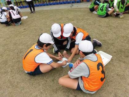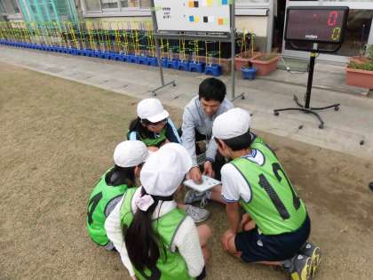 今日の授業では、「つながりタイム」を大切にしました。「つながりタイム」とはチームで腰を下ろして話し合う時間です。動きや声掛けの振り返りを行い、次の試合に生かしていきます。真剣に自分たちの動きを分析する子供たちの姿を見て、さすが6年生だと思いました。