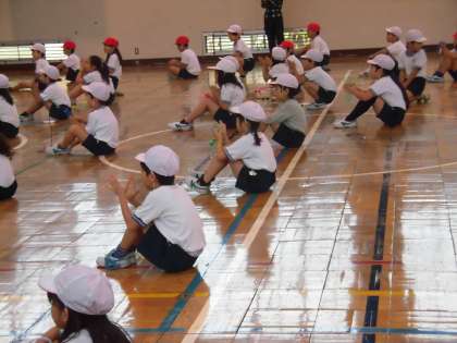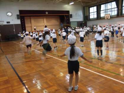 短なわの使い方のルールを確認したら、いよいよ短なわを使った練習が始まりました。舞台の上では、高学年のおねえさんが、一回旋一跳躍、あやとび、交差とび、二重とび、はやぶさなど、基本的な跳び方から難しい技まで、お手本を示してくれました。さすが高学年です。1・2年生の子供たちから大きな拍手が起こりました。そして、1・2年生の子供たちが、1分間続けて跳ぶ練習をしました。池之上小では、これからしばらく「なわとびカード」などを活用して、なわとびに取り組みます。