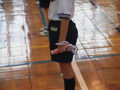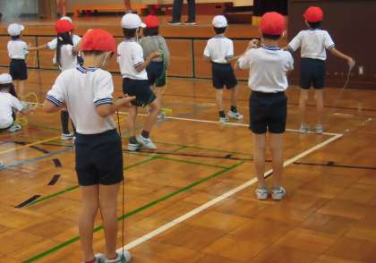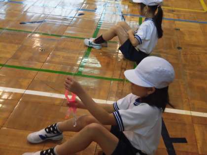 12月3日、今日は体育朝会が行われる予定でしたが、雨のため12月15日に延期になりました。この時間を利用して、1・2年生がこれからはじまる短なわの練習を体育館で行いました。最初に安全の確認です。なわとびの持ち方や結び方、長さの調整などを先生から教えていただきました。しっかり聞いて、正しく行動できました。
