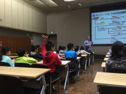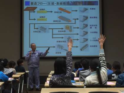 圧延の製造フローを見学した子供たち。真っ赤な鉄が圧延されていく様子に驚いていました。最後に全員が集まり、質問タイムです。たくさんの質問が出ました。熱心に学習する子供たちに、ていねいに説明してくださいました。