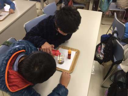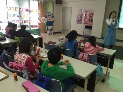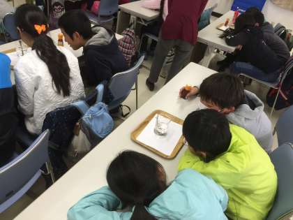 二ヶ所目の見学は、花王川崎工場です。環境について実験を行いながら考えました。水に入れた油(ラー油)に洗剤を入れ、油がどのように変化するか観察しました。洗剤の働きに「わー」と声を上げる子供たち。3人で仲良く実験を楽しむことができました。