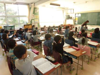 3学期の初日、子供たちは落ち着いて学習をスタートさせました。1年生は漢字の練習をしています。指で空書きをして、「本」という漢字の書き順や止め・はらいなどをていねいに確認していました。その後、先生の声掛けに合わせながら練習ノートを進めていき、自分たちで練習を重ねていく時間になりました。姿勢も大切にします。足を床にしっかりつけて、子供たちは熱心に漢字の練習に励んでいました。