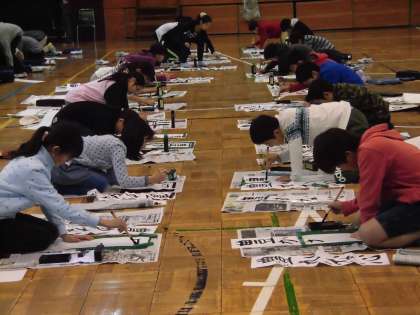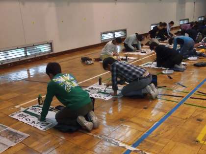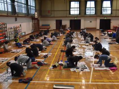 5・6年生の書き初め会の様子です。箏の調べが流れる体育館で、静かに心を落ち着かせ、書に向かう子供たちはどの子の真剣な面持ちです。6年生は「平和な春」、5年生は「豊かな心」に挑戦していました。子供たちの作品は、1月18日からの「書き初め展」で紹介します。