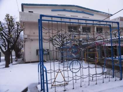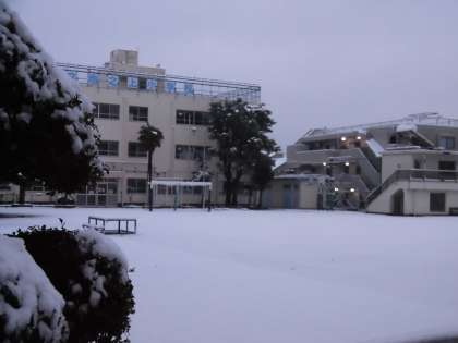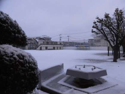 1月18日、未明から降り続いた雪のため、池之上小学校付近でも雪が積もっています。現在は、雨に変わり始めましたが、雪がシャーベット状になり、大変すべりやすくなっています。降り積もったが雪が樹木や建物の屋根から落ちてくることもあります。十分に気をつけて登校してください。